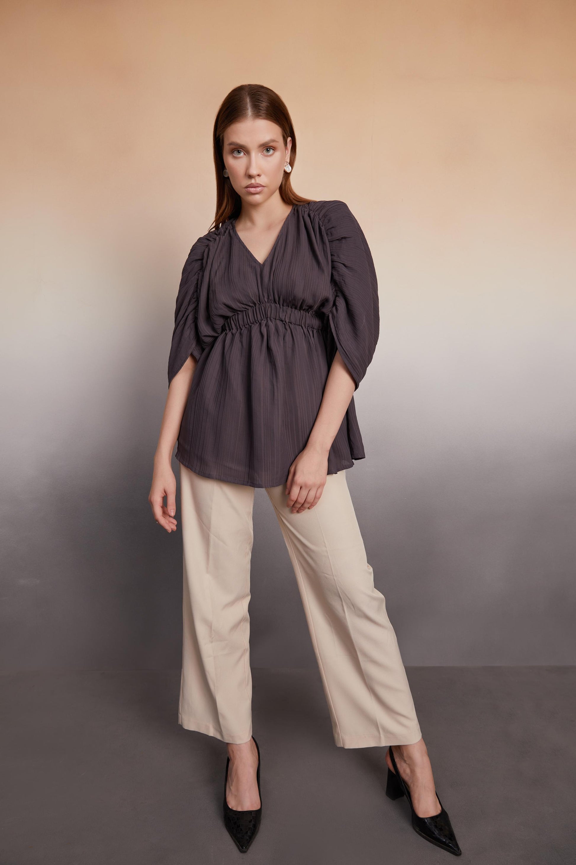Bring effortless elegance to your wardrobe with this charcoal tunic featuring dramatic ruched sleeves and a flattering V-neckline. The relaxed fit is enhanced by a cinched waist for a flowy yet structured silhouette. Made from lightweight, textured fabric, this tunic is perfect for creating versatile day-to-evening looks.
