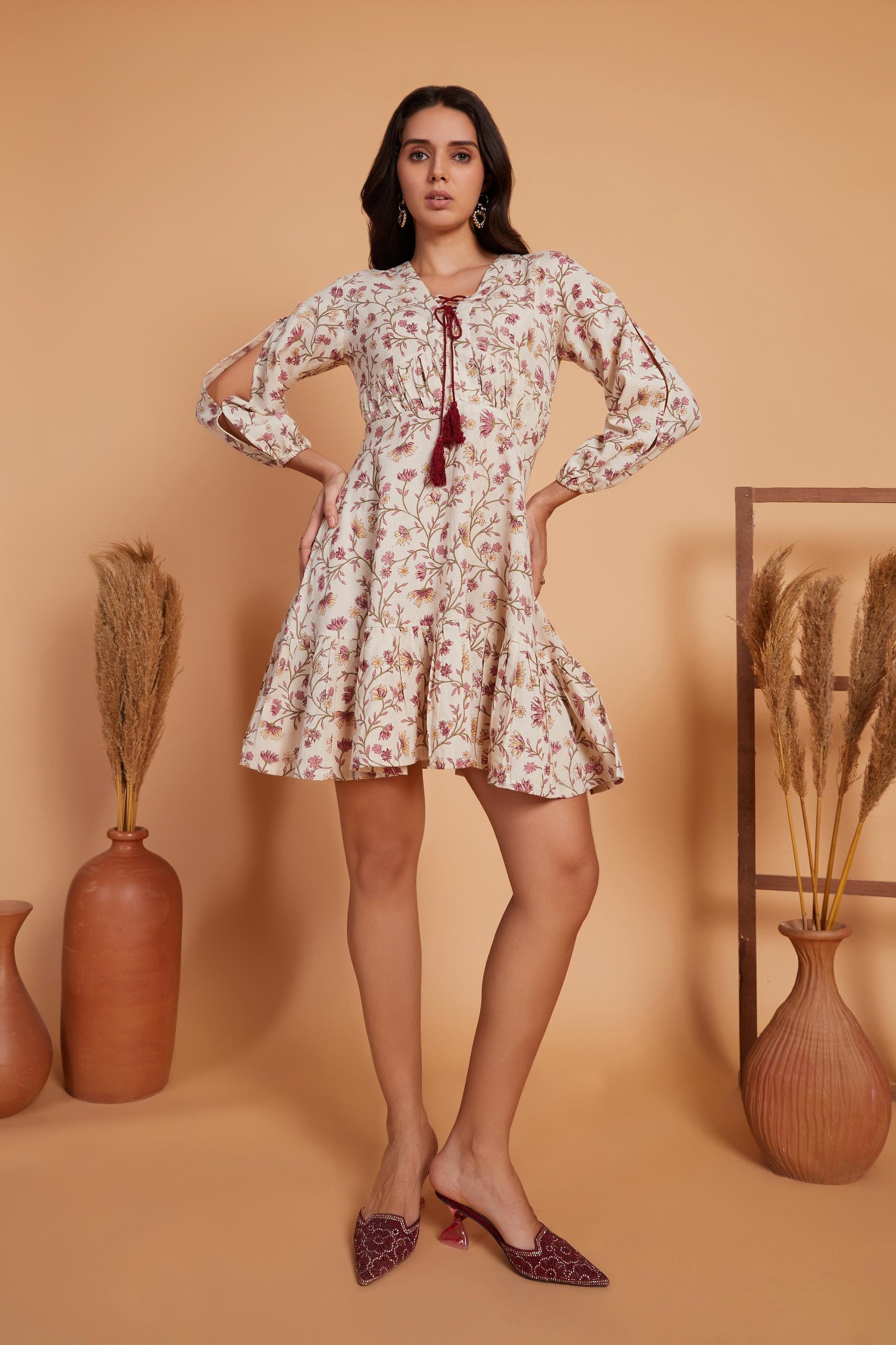 Embrace a bohemian-inspired look with this floral printed mini dress, perfect for casual outings or relaxed gatherings. Featuring a soft V-neckline with a tassel tie detail, this dress adds a playful charm to your wardrobe. The subtle gathers at the bodice and flared skirt create a flattering silhouette, while the slit sleeves add a touch of elegance. The delicate floral print in earthy tones makes this dress a versatile and timeless piece.