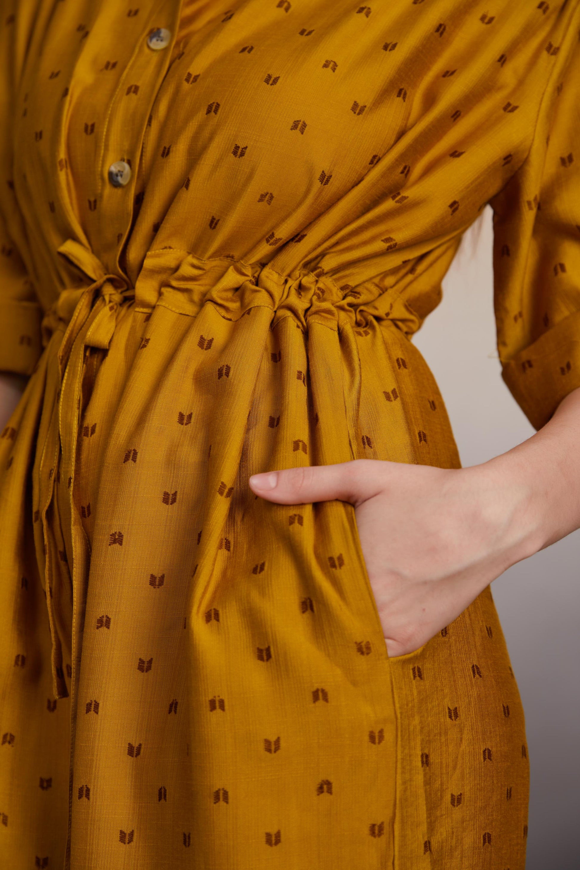Make a bold statement with this vibrant mustard jumpsuit, designed for style and versatility. Featuring a structured collar, short rolled-up sleeves, and a button-down front, this piece exudes effortless charm. The drawstring waist adds a flattering fit, while the wide-leg silhouette ensures comfort. The subtle textured design adds a touch of sophistication, making it perfect for both casual and semi-formal occasions.