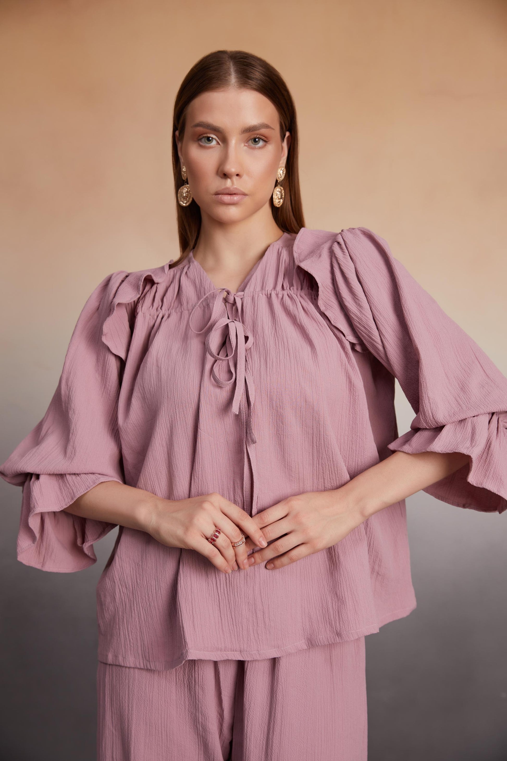 Elevate your wardrobe with this dusty rose co-ord set, combining femininity with effortless style. The blouse features delicate ruffle details along the neckline and sleeves, along with a charming tie-up front for added elegance. Paired with relaxed wide-leg pants, this set exudes a relaxed yet polished aesthetic, making it perfect for both casual outings and semi-formal occasions. Crafted from lightweight, textured fabric, it ensures all-day comfort without compromising on style.
