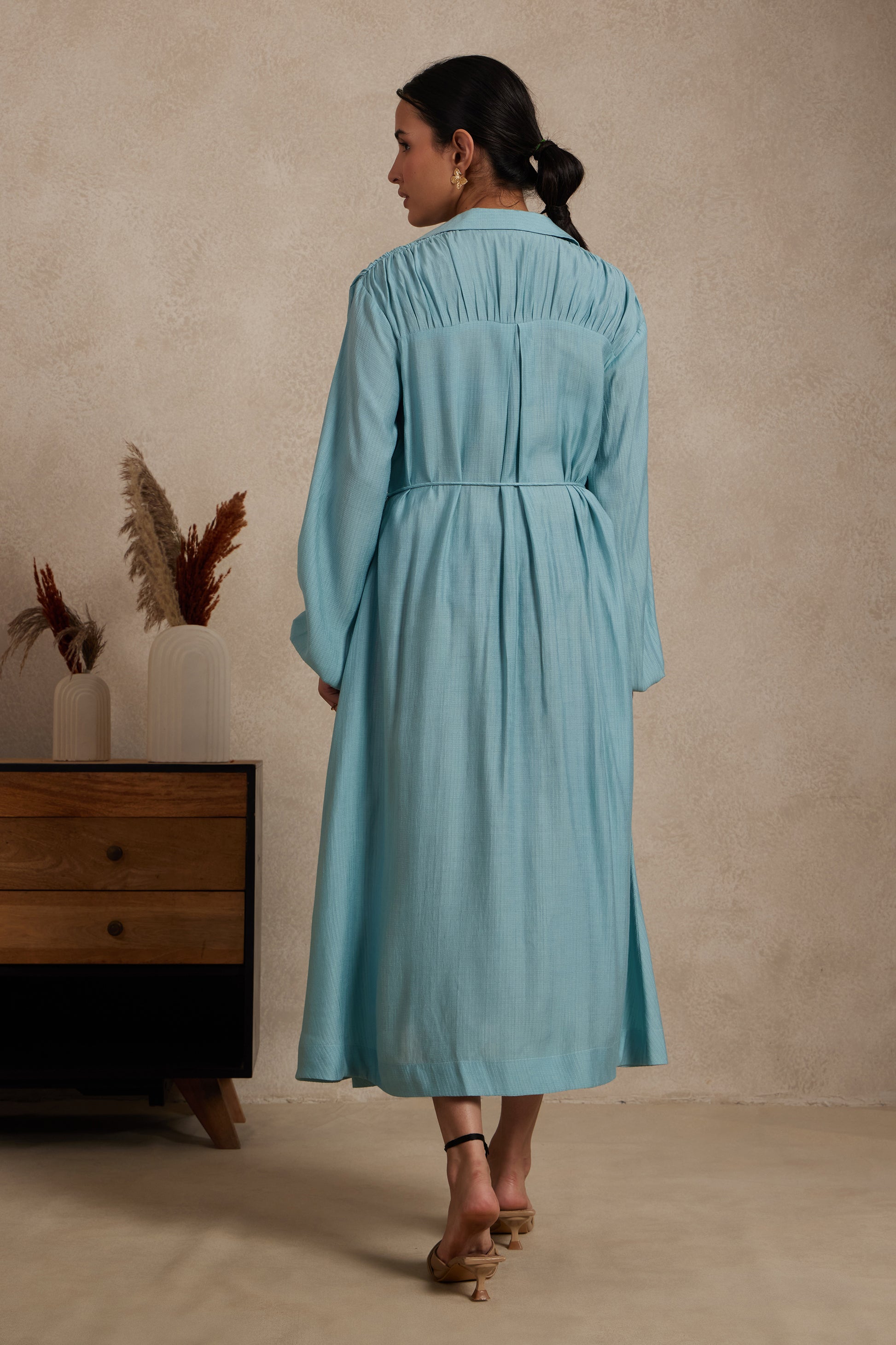 Refined yet relaxed, this sky blue shirt dress is your go-to for sophisticated everyday dressing. Featuring a collared neckline and wooden button-down front, its gathered detailing around the yoke and waist offers a soft, textured look. The adjustable drawstring flatters the silhouette while full-length sleeves add graceful movement. Crafted from lightweight cotton-blend fabric, this midi dress blends elegance with ease — perfect for workdays or casual evenings.