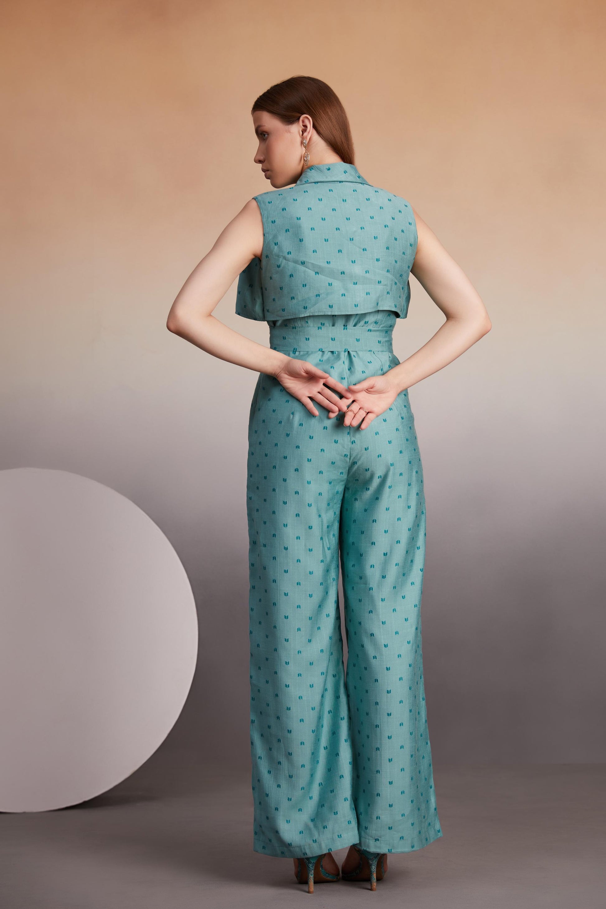 Elevate your style with this striking teal jumpsuit, designed for modern elegance and comfort. The sleeveless design features a button-down front and a belted waist to define your silhouette. A standout cape overlay adds a unique flair, while the subtle textured pattern enhances its chic appeal. Perfect for brunch dates or evening gatherings, this jumpsuit combines sophistication with ease.