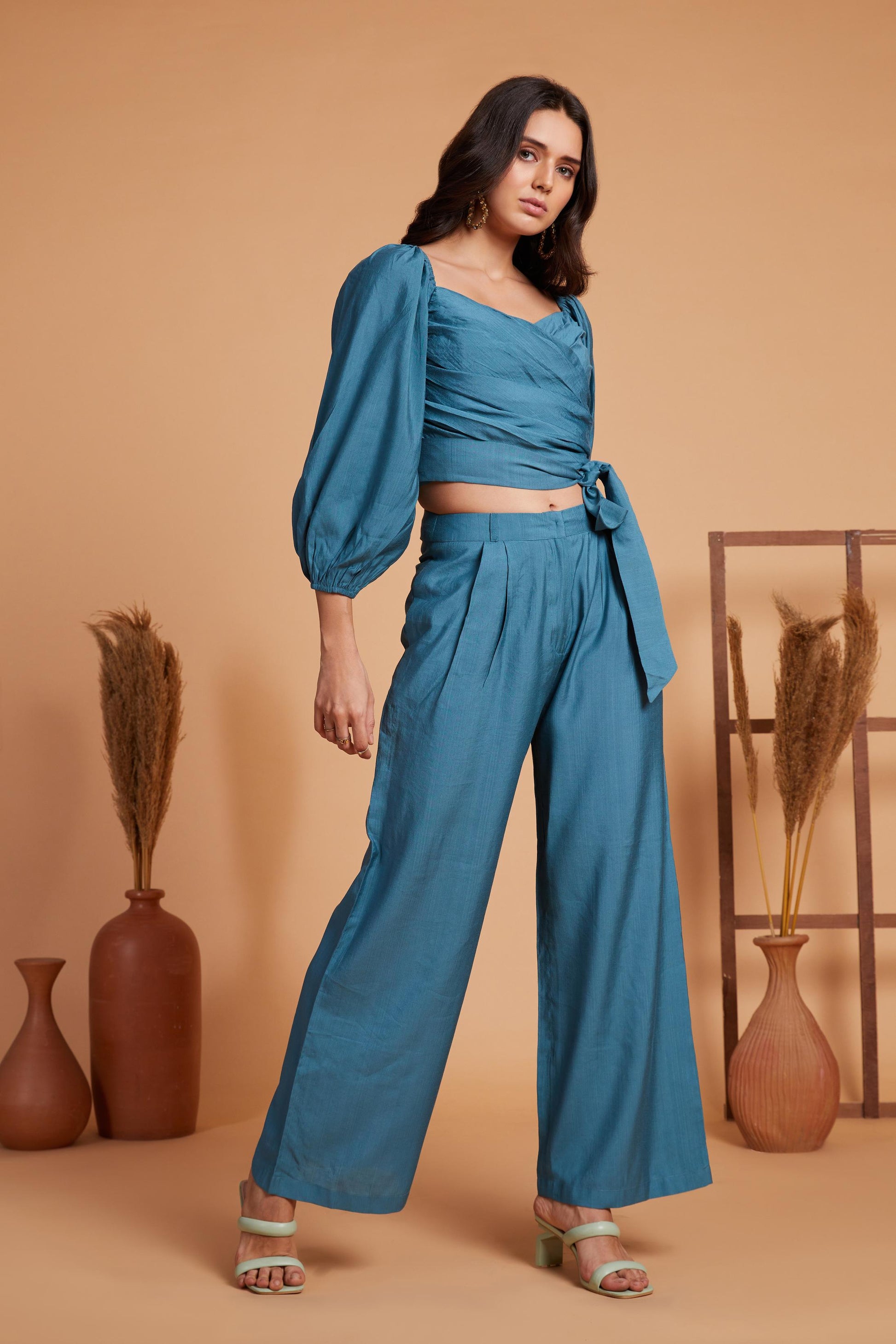 Channel modern elegance with this chic teal co-ord set, designed for effortless style. The wrap-style crop top features a sweetheart neckline and balloon sleeves, adding a touch of sophistication. A self-tie detail at the waist ensures a customizable and flattering fit. Paired with high-waisted, wide-leg trousers that boast a tailored silhouette, this ensemble is perfect for both casual outings and semi-formal events.