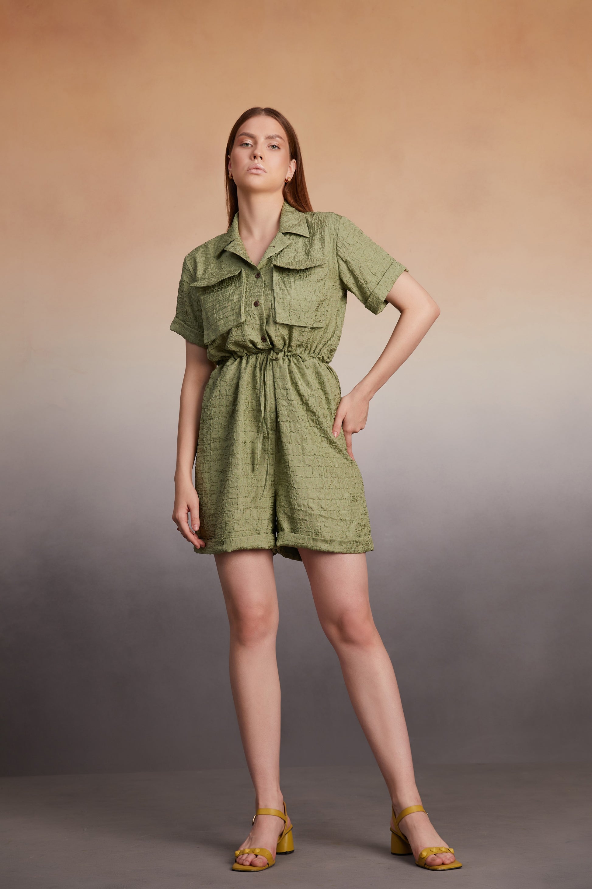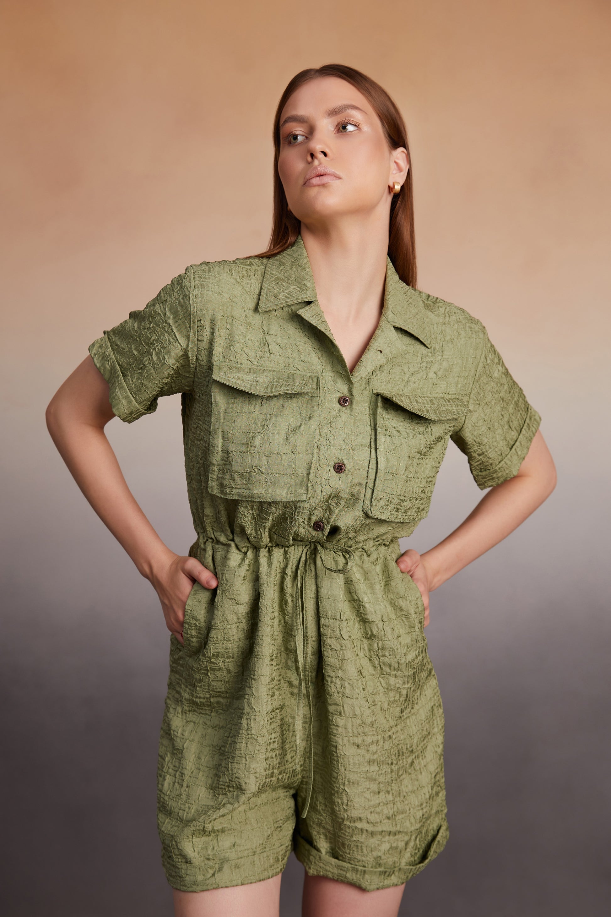 Step into contemporary ease with this textured olive utility romper — a perfect blend of comfort and functionality. With its relaxed silhouette and utilitarian details, this piece is designed for the modern woman on the move.