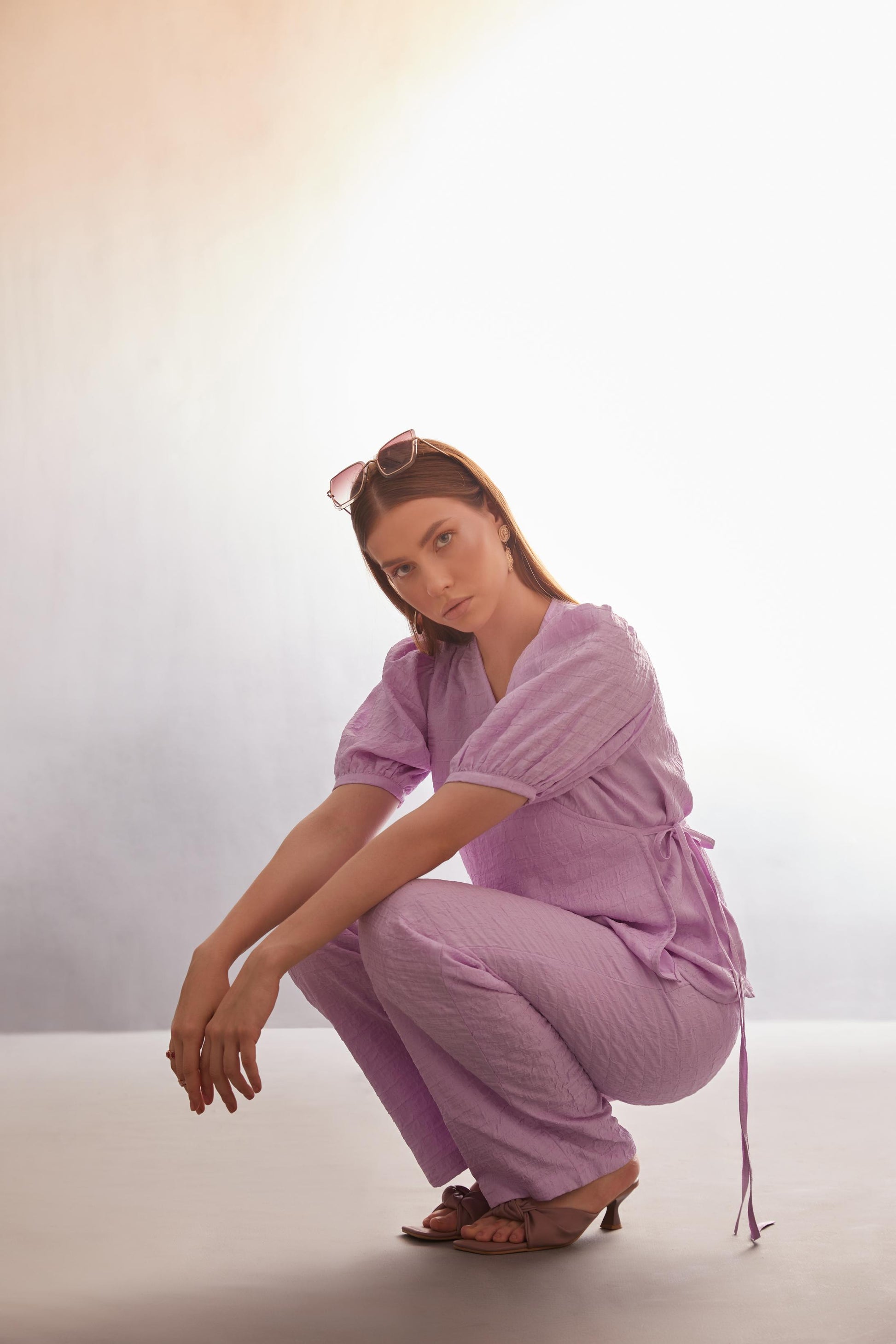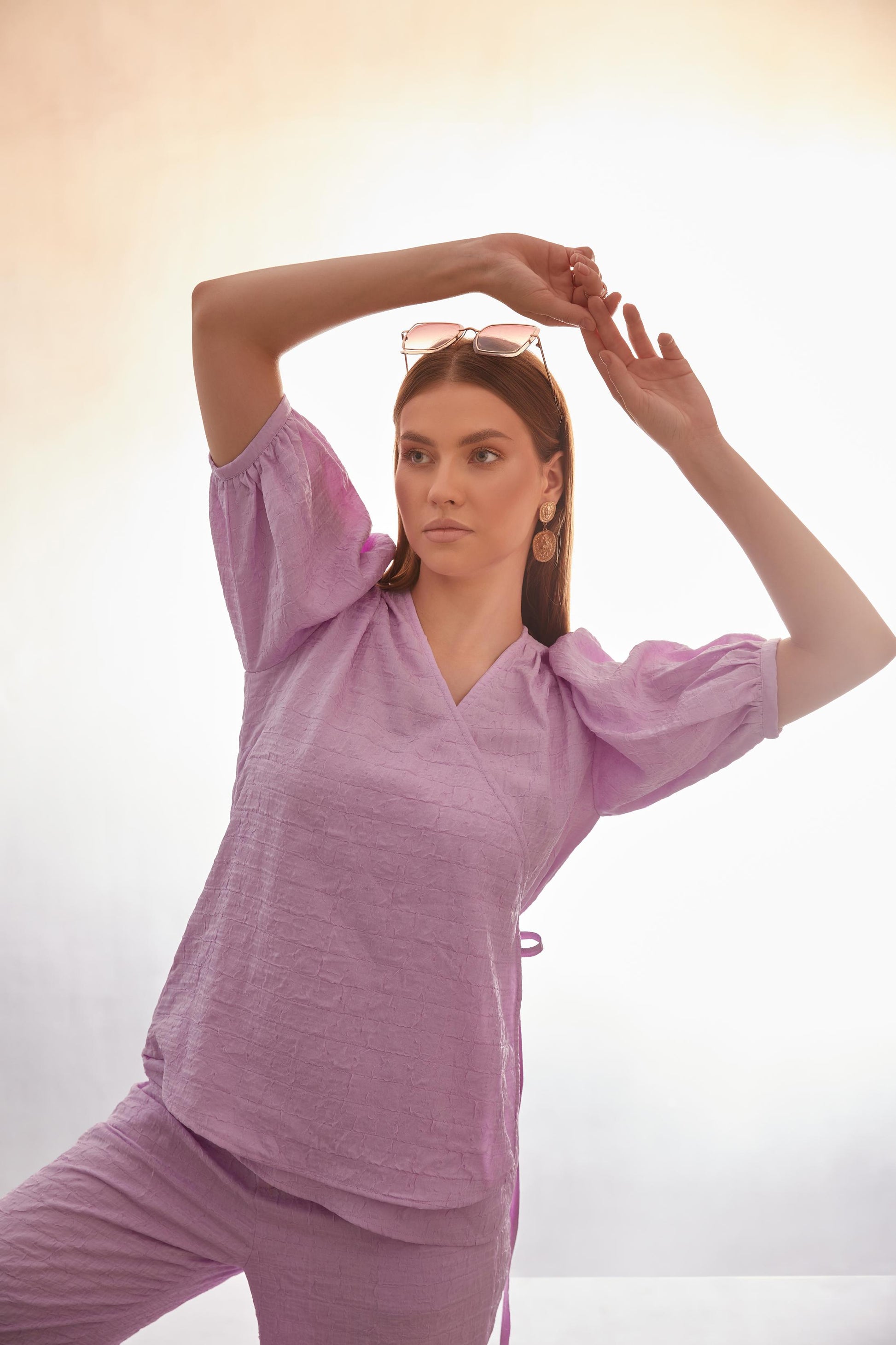 Redefine effortless style with this textured lilac co-ord set, designed for ultimate comfort and elegance. Featuring a wrap-style top with a flattering V-neckline and side tie detail, this outfit is perfect for casual days or elevated moments. The short puff sleeves add a feminine touch, while the wide-leg pants offer a relaxed yet chic silhouette. Crafted in a breathable, textured fabric, this set is as versatile as it is stylish.