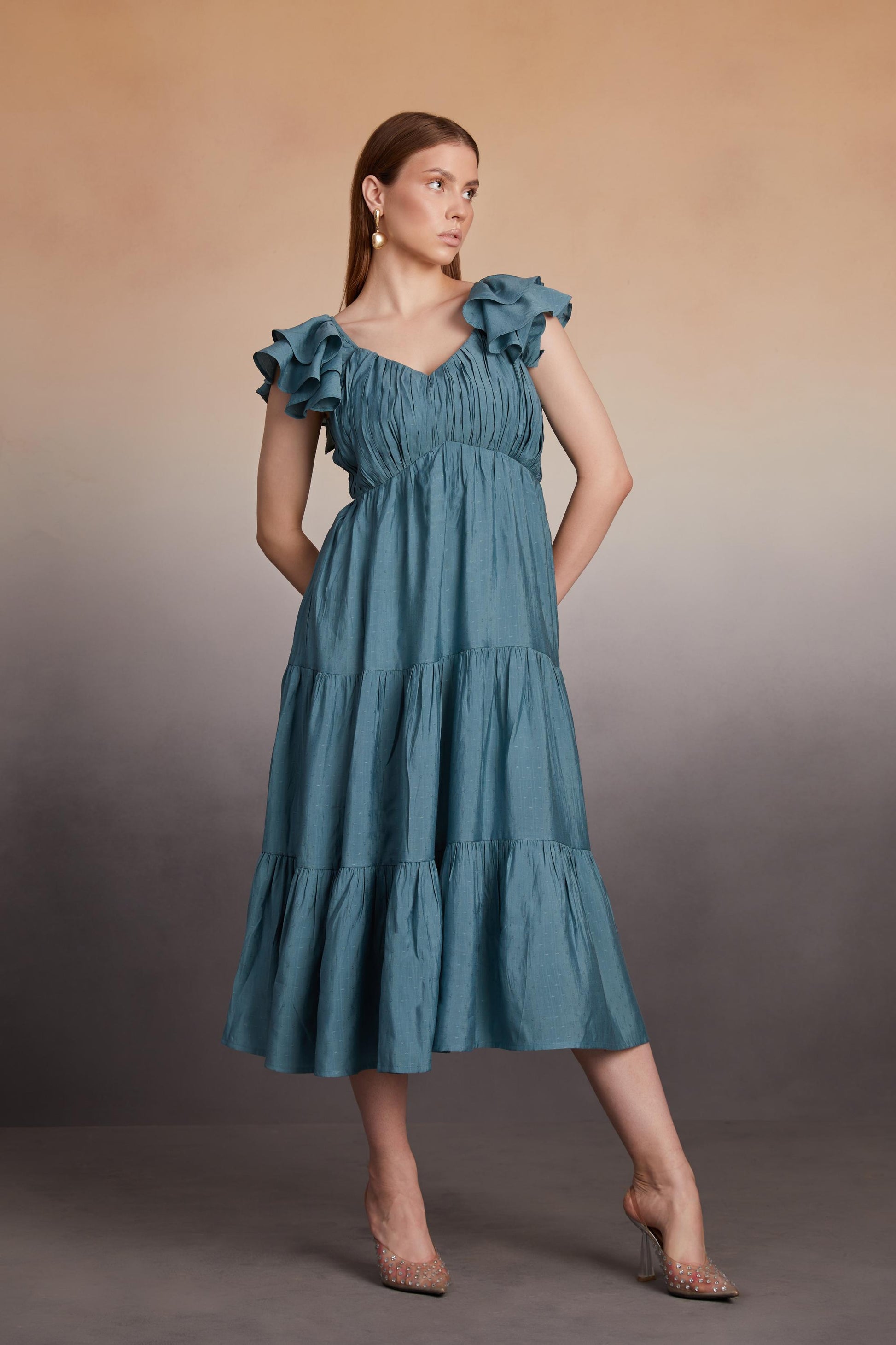 Add a touch of romantic charm to your wardrobe with this tiered midi dress, featuring beautifully layered ruffled sleeves and a flattering V-neckline. The ruched bodice provides a tailored fit, flowing into a tiered skirt that creates an airy and feminine silhouette. Made from a textured, lightweight fabric in a serene teal hue, this dress is perfect for brunch dates, garden parties, or an effortless day out.